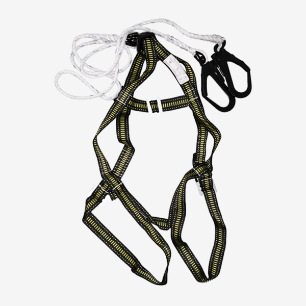 Professional yellow-black safety harness with strong PP rope and powder-coated hook. Lightweight yet strong for height safety applications.